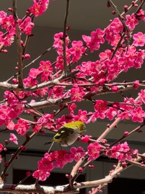 国分寺クラスの後、スタジオの前にある紅梅の花にメジロが来ていました