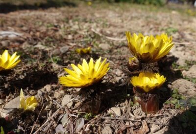 厳しい寒さを乗り越え、地面から力強く芽吹いて咲く福寿草の花