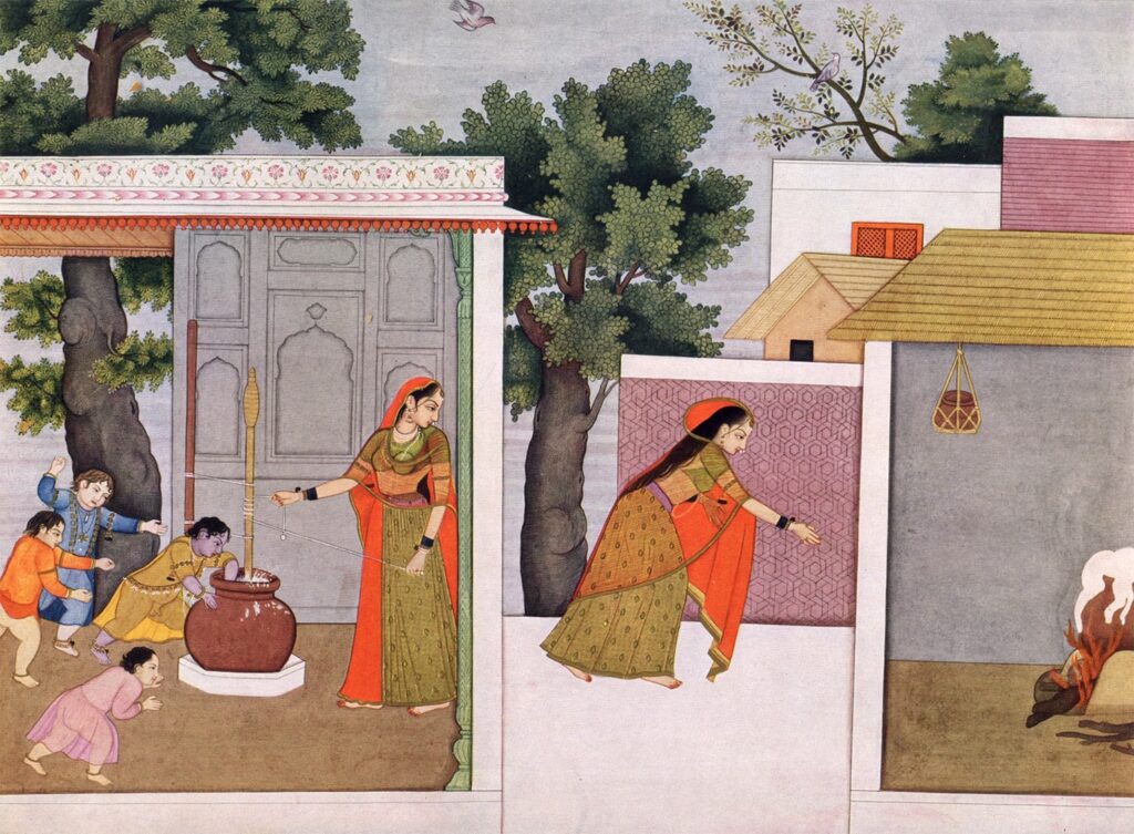幼いクリシュナは、友だちとともに家々に忍び込み、大好物のバターを盗み食いするいたずらをします。母や村人たちは困りながらも、クリシュナを愛さずにはいられません。手間をかけて作られるバターは純粋さのエッセンスであり、神はそれを好み、私たちの行為の結果はすべて神への供物として捧げられるものという教えが含まれているそうです。