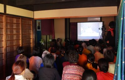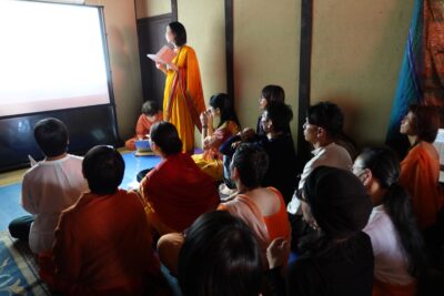 今回、師がどのようにしてアーシュラマに来られる方々を迎えて来られたか師の貴重な手書きの資料がサルヴァーニーさんによって紹介され、「ヨギさんがどれほど通われている方のことを思ってヨーガの話をする機会を作ってくださったか。今度は私たちが見倣い、行為していく番だと思います」と力強く話されました。会の後半に、師がアーシュラマでアーサナのクラスをされていた時の映像が公開されました。師の真剣な表情に会場から「かっこいい!!!」とため息交じりの声が上がりました。その方がジャヤンティー後に「指導する時のあの鋭く真剣な眼差しに、あなたは真剣かを突きつけられました」とコメントをくださいました。